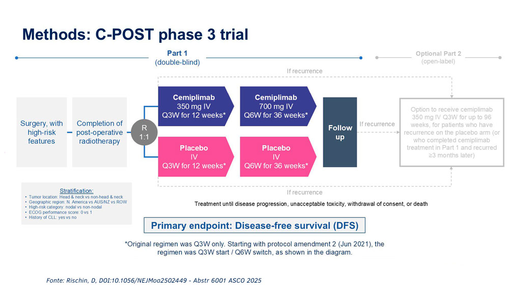 Apesar dos avanços, não há tratamento sistêmico aprovado para pacientes com CEC com alto risco de recorrência locorregional ou à distância, após cirurgia com intenção curativa e radioterapia adjuvante. C-POST é um estudo randomizado, duplo-cego, multicêntrico, de fase 3, que busca avaliar cemiplimabe nessa população de pacientes.