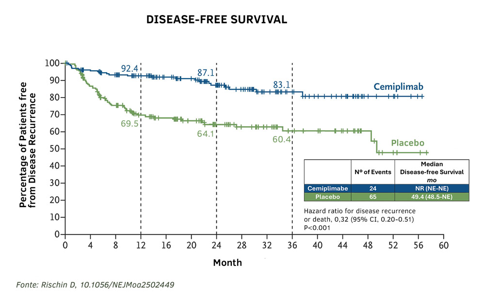 Cemiplimabe também cumpriu os principais desfechos secundários, reduzindo significativamente o risco de recorrência locorregional (9 eventos vs. 40 com placebo; razão de risco, 0,20; IC de 9%, 0,09 a 0,40) e de recorrência à distância (10 vs. 26 eventos; razão de risco, 0,35; IC de 95%, 0,17 a 0,72).