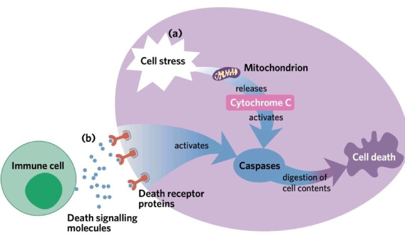 Existem duas vias de apoptose: a mitocondrial e a via do receptor de morte, ambas as quais causam a ativação das enzimas caspase. Após a ativação da caspase, as duas vias se tornam quase idênticas.