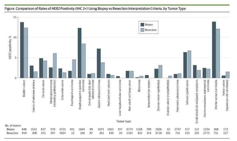 Estudo publicado recentemente no JAMA Oncology sugere que a incidência de positividade para HER2 é baixa em todos os tipos de tumor. Pesquisadores testaram mais de 65 mil pacientes com mais de 30 tipos de tumores sólidos e constataram que a taxa de positividade para HER2 foi de cerca de 3%.