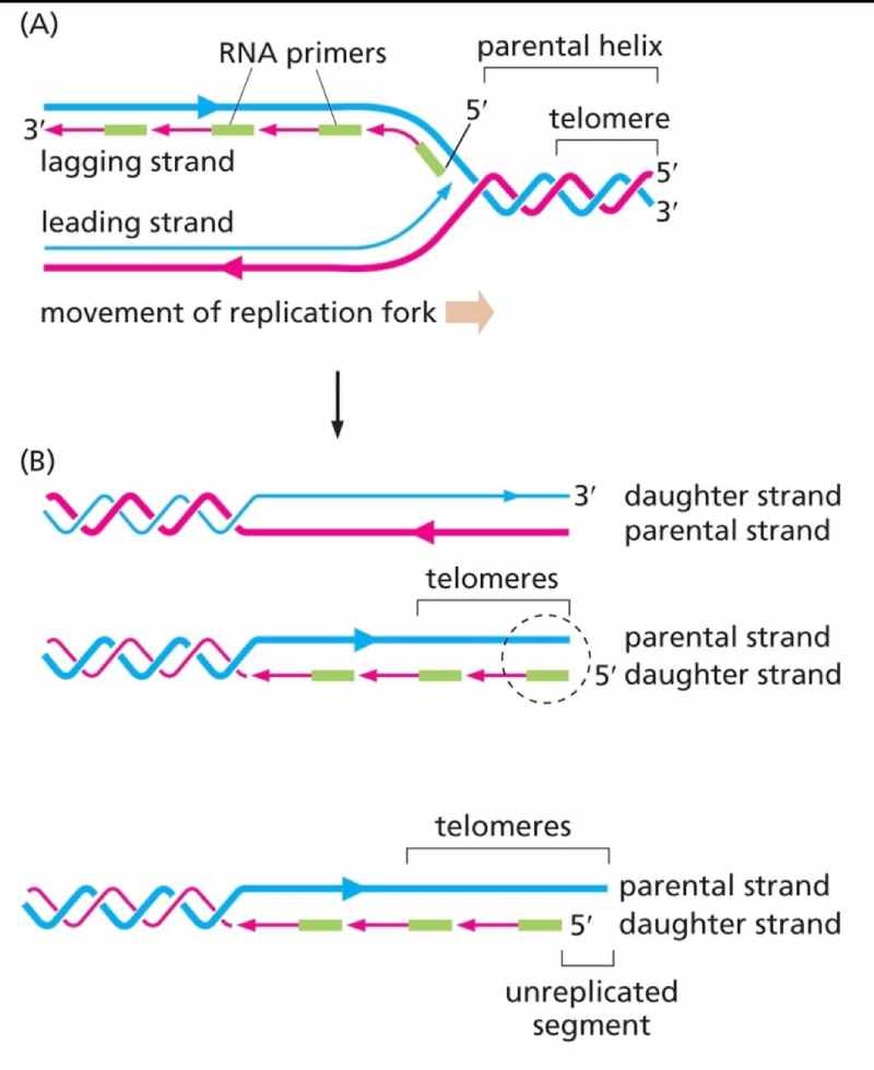 Consequentemente, há sub-replicação da fita parental de DNA e perda de um trecho limitado de sequências de DNA telomérico do cromossomo de uma célula filha. Além disso, certas exonucleases degradam esse trecho específico de DNA, agravando os efeitos da sub-replicação. A orientação 5' para 3' de cada fita é indicada pelas pontas de seta. As fitas parentais de DNA são desenhadas mais espessamente do que as fitas filhas recentemente sintetizadas, conforme ilustrado na figura abaixo.