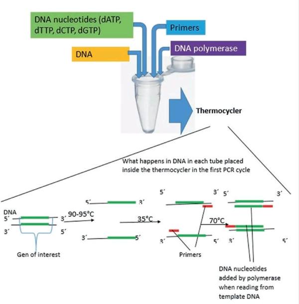 Com essa metodologia, é possível produzir uma quantidade enorme de cópias de pequenas porções do DNA que se deseja estudar, pois trata-se de uma replicação in vitro acelerada de segmentos de DNA. Consiste em colocar no mesmo espaço todos os elementos necessários para a síntese de DNA: DNA molde, primers, DNA polimerase e desoxirribonucleotídeos livres. Todos eles estão localizados em um tubo de ensaio colocado dentro de um termociclador, que por sua vez é capaz de fornecer grandes variações de temperatura em pequenos períodos de tempo, alcançando assim três etapas fundamentais: