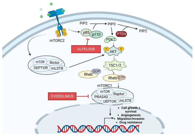 O alpelisibe é um inibidor seletivo do PI3K, atuando especificamente na subunidade p110α. Ao inibir o PI3K, o alpelisibe bloqueia a formação de PIP3, impedindo a ativação subsequente do AKT e do mTORC1. O everolimo, por outro lado, é um inibidor do mTORC1. Ao inibir o mTORC1, o everolimo prejudica diretamente os sinais de crescimento e proliferação celular impulsionados pelo AKT. O capivasertibe inibe a via da cinase AKT, um regulador essencial do crescimento e da sobrevivência celular em muitos tipos de câncer. Ele atua ligando-se às três isoformas de AKT (AKT1, AKT2 e AKT3), impedindo sua fosforilação e ativação, interrompendo assim as vias de sinalização subsequentes que promovem a proliferação e a sobrevivência das células tumorais.