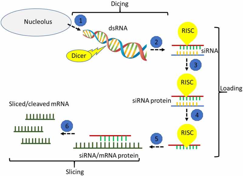 O processo começa com RNA fita dupla (dsRNA), que pode se originar de vírus, transposons ou RNA endógeno. Uma enzima chamada Dicer reconhece o dsRNA e o cliva em pequenos RNAs interferentes curtos (siRNAs; normalmente de 20 a 25 nucleotídeos de comprimento.