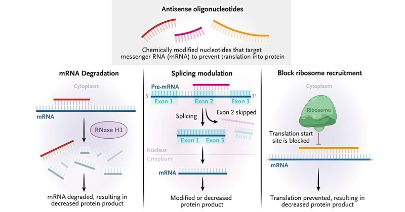 Os oligonucleotídeos antisenso podem se ligar diretamente ao mRNA, levando à degradação do mesmo; podem inibir a geração de mRNA maduro bloqueando o splicing de formas precursoras de mRNA; ou podem bloquear o recrutamento de ribossomos para inibir a tradução de proteínas. Os oligonucleotídeos antisenso também podem ser projetados para atingir outros RNAs, como microRNAs e RNAs não codificantes longos (ncRNAs).