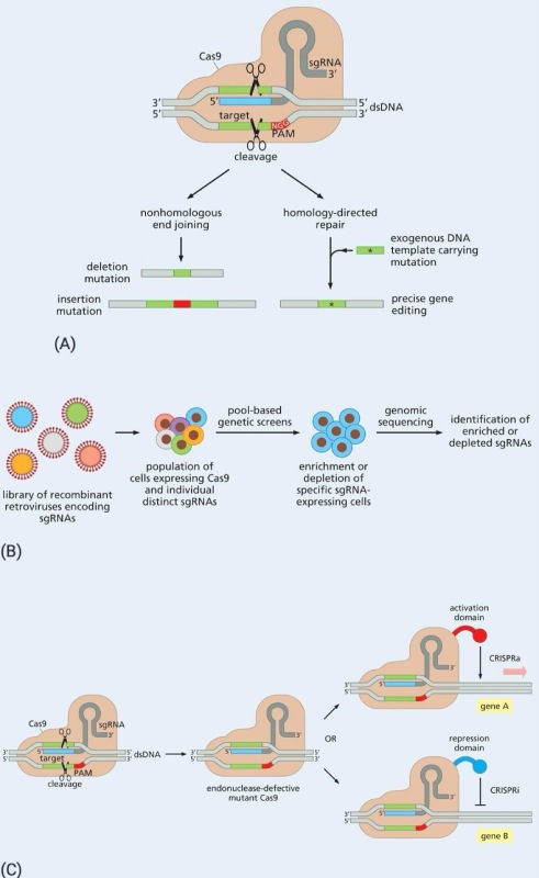 Para realizar triagens genéticas baseadas em CRISPR, bibliotecas de retrovírus recombinantes são construídas, de modo que cada vírus carregue um sgRNA diferente visando a um gene específico. Esses vírus são usados para infectar células que expressam Cas9. A mutação subsequente mediada por CRISPR/Cas9 leva à geração de uma população de células com mutações direcionadas de perda de função nos genes correspondentes. Submeter essas células a condições seletivas causa enriquecimento ou depleção de certas células mutantes. Para triagens baseadas em enriquecimento, a identidade de mutações selecionadas pode ser determinada após sequenciamento de DNA das porções de sgRNA dos provírus retrovirais presentes nas células mutantes restantes. Para triagens baseadas em depleção, compara-se a representação de sequências de sgRNA na população inicial de células àquela presente após o crescimento nas condições seletivas; sequências de sgRNA que são relativamente sub-representadas na população final são indicativas de genes nos quais a mutação levou a uma desvantagem de aptidão.