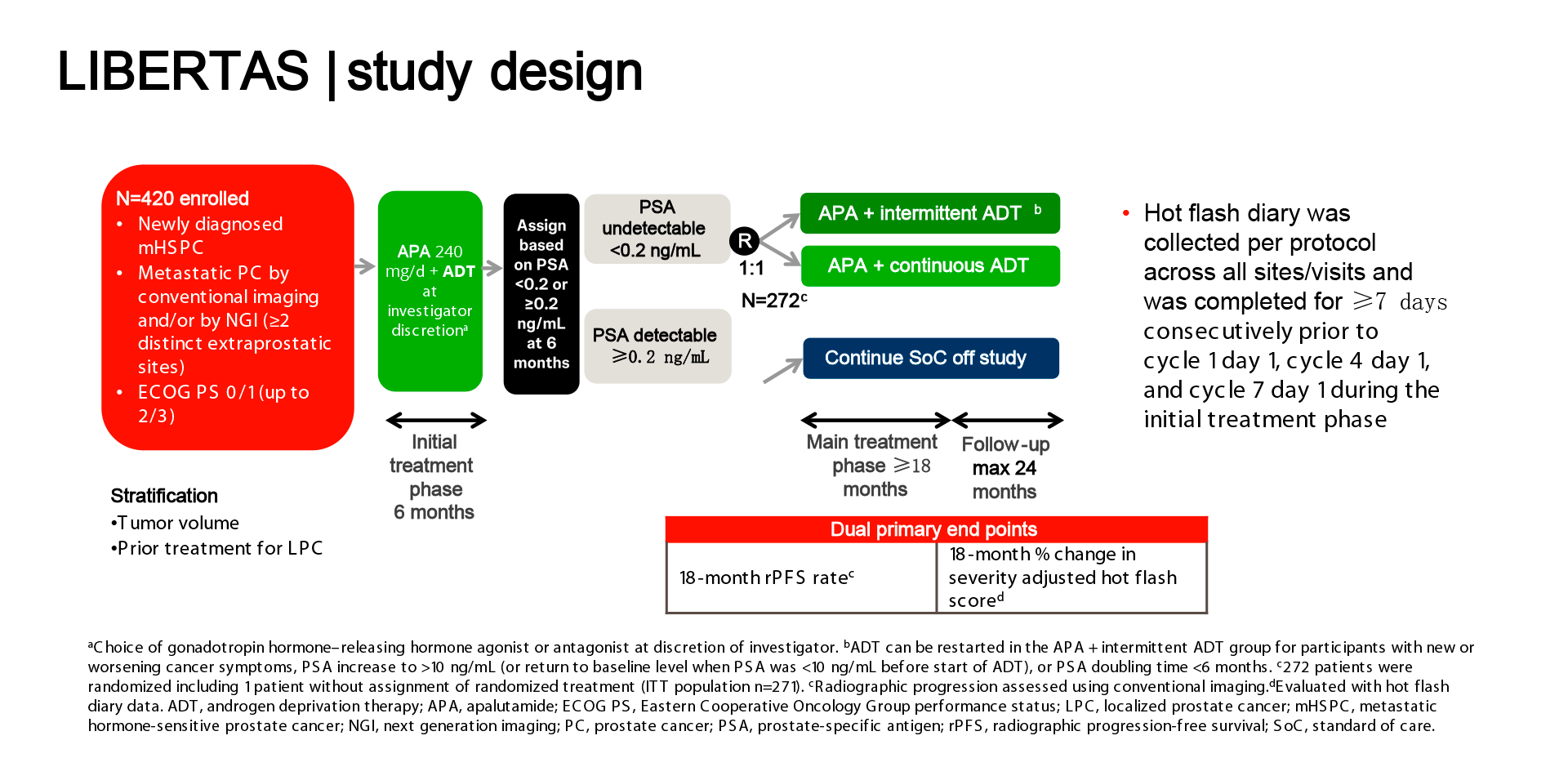 Dados atualizados mostram que 420 pacientes foram incluídos para a fase inicial do tratamento de 6 meses, envolvendo 73 centros de pesquisa, em 9 países (conjunto de análise completa). Todos os participantes receberam APA 240 mg/d + ADT. Na fase principal de tratamento, os participantes com PSA confirmado <0,2 ng/mL após a fase inicial foram randomizados 1:1 para APA 240 mg/d + ADT intermitente ou contínua. Os desfechos primários incluíram sobrevida livre de progressão radiológica (SLPr) e redução da carga de ondas de calor (fogachos), medida por pontuação específica (ondas de calor ajustada pela gravidade).