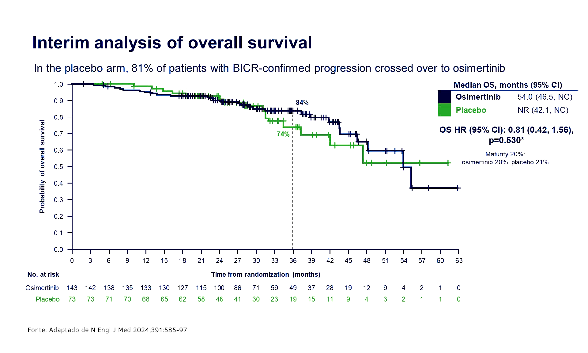 Os pacientes elegíveis foram estratificados (estágio IIIA vs IIIB/IIIC; chinês vs não chinês) e randomizados 2:1 para receber osimertinibe 80 mg ou placebo (PBO), até a progressão de doença ou toxicidade inaceitável. Imagens, incluindo ressonância magnética cerebral, foram obrigatórias no início do estudo, a cada 8 semanas até a semana 48, depois a cada 12 semanas até a progressão avaliada por comitê central independente cego (BICR). O desfecho primário foi a sobrevida livre de progressão (RECIST v1.1) avaliada por BICR. Os desfechos secundários incluíram sobrevida global (SG) e segurança. O corte de dados foi em 5 de janeiro de 2024.