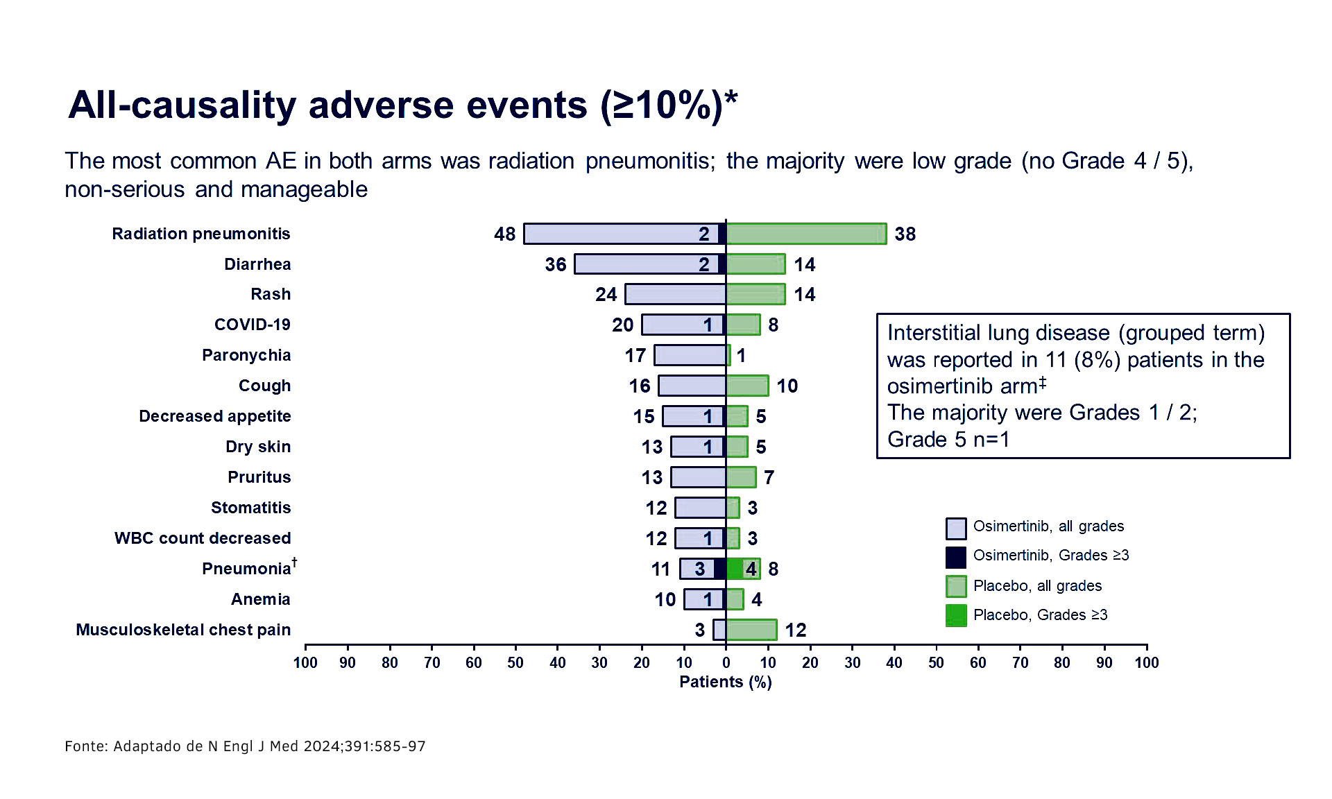 Em relação à segurança e tolerabilidade, eventos adversos foram relatados em 98% vs 88% dos pacientes nos grupos com osimertinibe vs QRT isolada, respectivamente. Eventos adversos (EAs) de grau ≥ 3 ocorreram em 35% vs 12%; EAs de pneumonite por radiação (termo agrupado): 48% (osimertinibe) vs 38% (PBO), maioria Grau 1/2. Quaisquer EAs que levaram à descontinuação foram relatados em 13% vs 5% para osimertinibe vs QRT isolada, respectivamente.3
