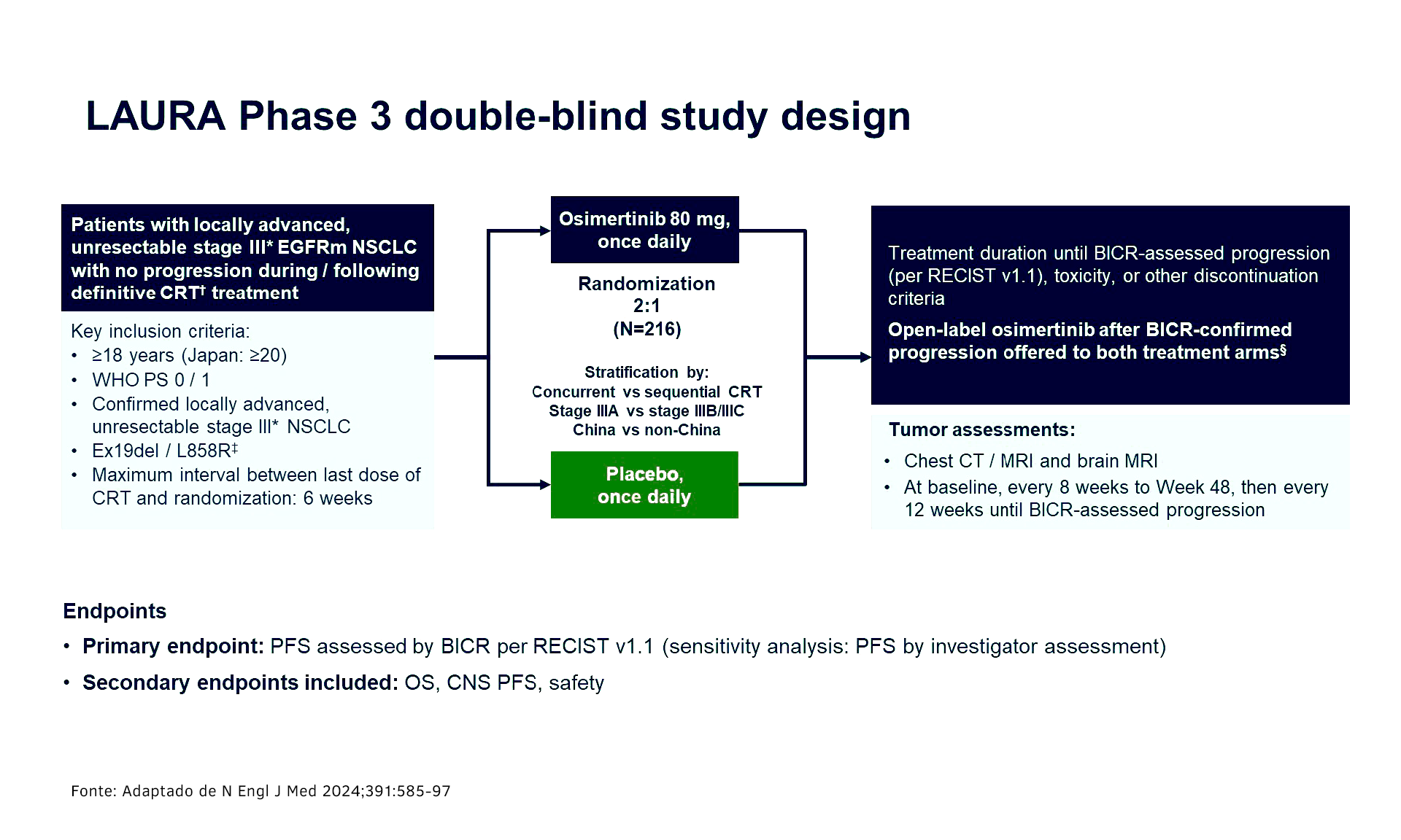 No estudo LAURA, um ensaio global de fase 3, duplo-cego, controlado por placebo (NCT03521154), o objetivo foi avaliar a eficácia e a segurança de osimertinibe no CPCNP EGFR mutado (EGFRm) em pacientes com doença estágio III, irressecável, sem progressão após quimiorradioterapia (QRT) definitiva baseada em platina.