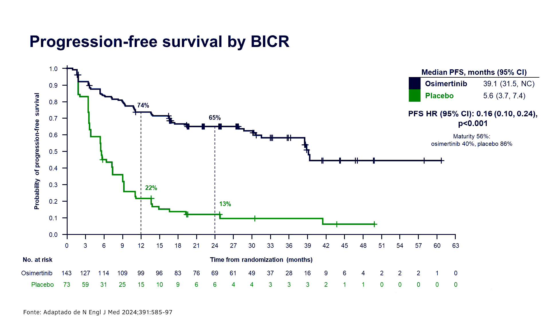 O tratamento com osimertinibe trouxe incremento significativo em SLP na avaliação por BICR (HR 0,16; IC de 95% 0,10, 0,24; p<0,001), reduzindo em 84% o risco de progressão da doença ou morte. A SLP mediana foi de 39,1 meses (IC de 95% 31,5, não calculável) para osimertinibe vs 5,6 meses (IC de 95% 3,7, 7,4) para PBO. A taxa de SLP em 12 meses foi de 74% (osimertinibe) vs 22% (PBO); a taxa de SLP em 24 meses foi de 65% (osimertinibe) vs 13% (PBO). A SLP avaliada pelo investigador (HR 0,19; IC de 95% 0,12, 0,29; p nominal < 0,001) foi consistente com a SLP avaliada por BICR. O benefício de SLP foi consistente em todos os subgrupos predefinidos.