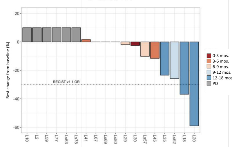 Gráfico: Waterfall plot representing best change in OVERALL RECIST v1.1 score after SBRT