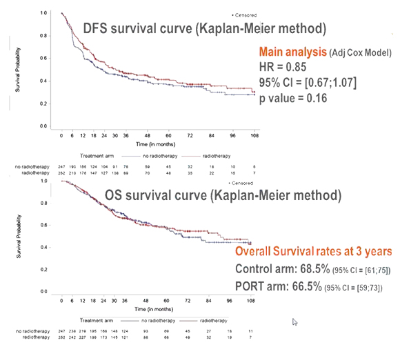 A sobrevida livre de doença foi de 47,1% no braço PORT e 43,8% no braço controle, portanto, não estatisticamente significativa, com razão de risco de = 0,85 (IC 95% = [0,67; 1,07]; p = 0,16). A sobrevida global em três anos foi de 66,5% (IC 95% = [59; 73]) dos pacientes no braço PORT em comparação com 68,5% (IC 95% = [61; 75]) no braço controle, ambas acima do esperado. A falha mediastinal foi reduzida quase pela metade utilizando PORT, de 46% para 25%. PORT foi associado a uma diferença, não significativa, de 15% em redução de sobrevida livre de doença nos pacientes estádio IIIAN2, sem diferença em sobrevida global.