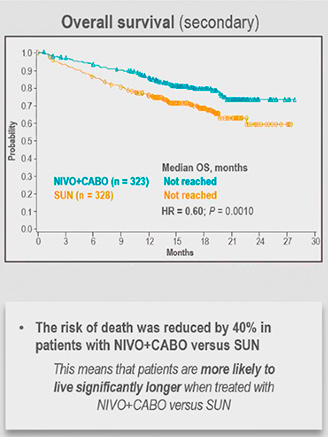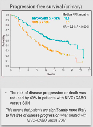651 pacientes (22,6% risco favorável, 57,6% risco intermediário, 19,7% risco ruim; 24,9% PD-L1 ≥1%) foram randomizados para nivolumabe mais cabozantinibe (N + C; n = 323) versus sunitinibe (S; n = 328). Em um período mediano de 18,1 meses de acompanhamento todos os endpoints de eficácia foram atendidos. N + C melhorou significativamente a SLP (HR 0,51 [IC 95% 0,41–0,64], P <0,0001; mediana, 16,6 versus 8,3 meses) e a SG (HR 0,60 [98,89% CI 0,40-0,89]; P = 0,0010; medianas não alcançadas) vs sunitinibe. Os resultados foram consistentes, independentemente do score de risco IMDC pré-especificado e em todos os subgrupos PD-L1. A ORR (IC de 95%) foi significativamente maior com N + C v S (55,7% [50,1–61,2] versus 27,1% [22,4-32,3]; P <0,0001), e 8,0% vs 4,6% dos pacientes obtiveram resposta completa. A mediana de duração de resposta foi de 20,2 vs 11,5 meses, novamente com superioridade do braço de combinação.