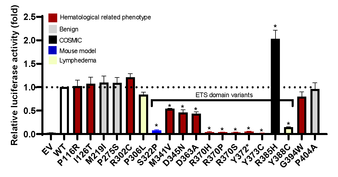 O estudo caracterizou funcionalmente 19 variantes de ERG, 12 potencialmente patogênicas, 1 variante patogênica de camundongo conhecida e 3 controles populacionais, demonstrando que a maioria das variantes missense do domínio ETS apresentam características de perda de função, interrompendo a transativação transcricional (Figura), ligação ao DNA e/ ou localização nuclear in vitro. Dados preliminares robustos de modelos ex vivo de superexpressão de ERG em células hepáticas fetais de camundongos em cultura de tecidos (independência de citocinas), um ensaio de transplante de camundongo e modelos anteriores de camundongos ERG com mutação de linha germinativa são concordantes com variantes missense do domínio ETS, sendo a perda de função (LOF) comparada ao ERG de tipo selvagem e controles benignos. Juntos, esses dados fornecem estudos funcionais clínicos, in vitro e ex vivo, implicando variantes de LOF na predisposição a doenças hematológicas. Mutações LOF ERG também ocorrem em casos esporádicos de MH.