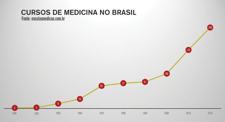A expansão do ensino superior ampliou as oportunidades de acesso às faculdades de medicina e o número de alunos saltou de 46.881 em 1991 para 108.033 em 2011. O Censo do Ensino Superior de 2010 contabilizava 197 cursos de medicina no País - 83 públicos (42,1%) e 114 cursos privados (57,9%). Do total, 70 escolas de graduação médica (35,5%) tinham menos de 10 anos, segundo o Censo, que é realizado pelo Instituto Nacional de Estudos e Pesquisas Educacionais Anísio Teixeira (Inep), do Ministério da Educação (MEC).