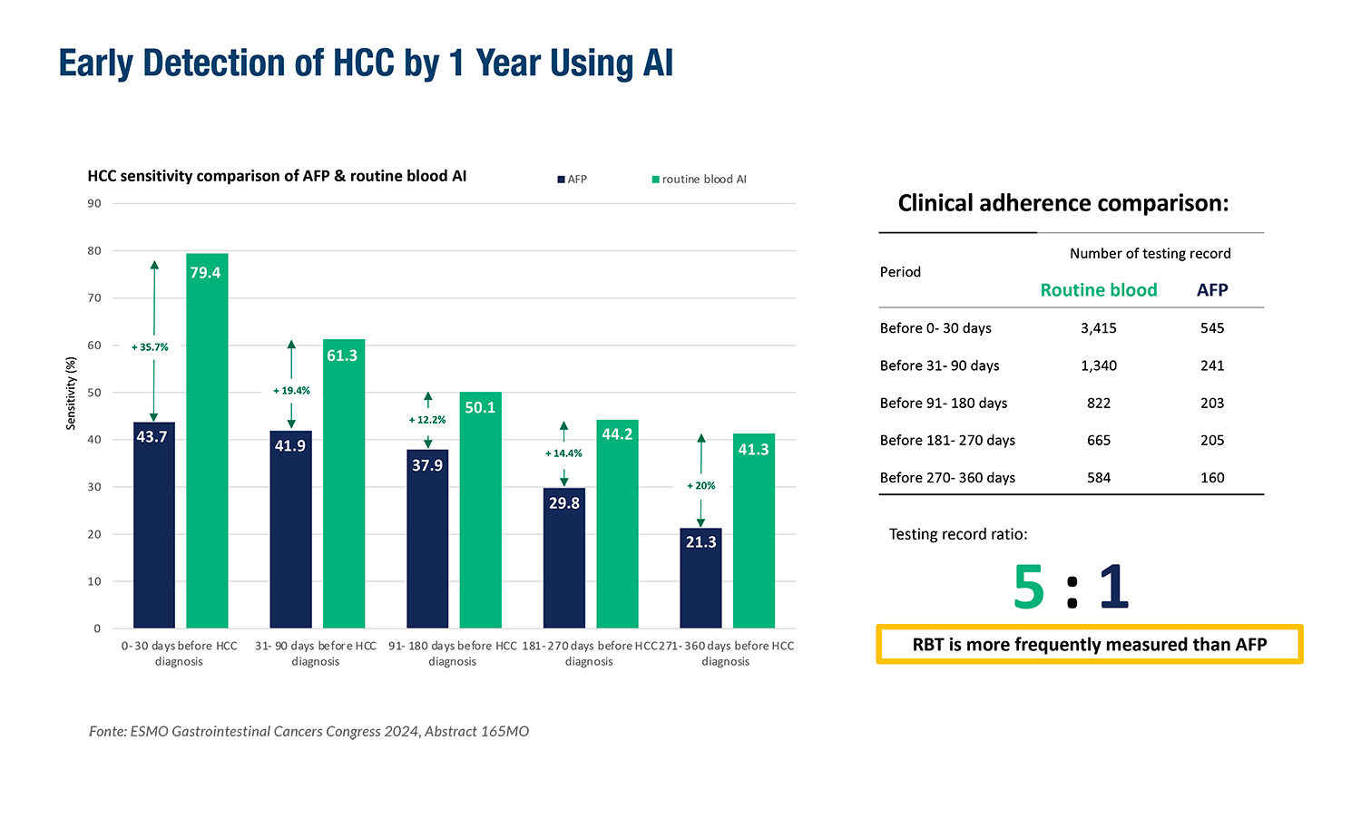 A detecção precoce do carcinoma hepatocelular (CHC) continua desafiadora diante da sensibilidade limitada do teste de alfa-fetoproteína (aFP) e da ultrassonografia inconclusiva no fígado cirrótico. Pesquisa anterior do mesmo grupo asiático possibilitou a construção de um classificador de IA com base em exames de sangue de rotina para detecção de CHC (sensibilidade: 0,80, especificidade: 0,81 AUROC: 0,894 no ponto de corte 0,43, treinado por dados de 220 mil pacientes). No ESMO GI 2024, o objetivo foi avaliar se essa assinatura sanguínea de IA pode ser detectada até 1 ano antes do diagnóstico clínico.