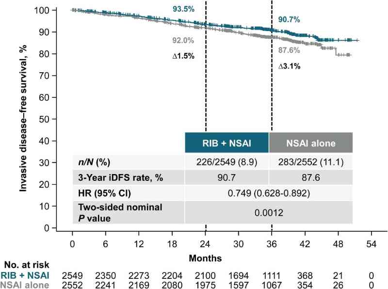Os resultados relatados por Hortobagy et al. no Annals of Oncology mostram que as taxas de SLDi foram de 90,7% (IC de 95% 89,3%-91,8%) vs 87,6% (IC de 95% 86,1%-88,9%) favorecendo ribociclibe associado à terapia endócrina versus terapia endócrina isolada. Um benefício consistente foi observado em subgrupos pré-especificados, incluindo estágio (II/III) e status nodal (+/−). A análise também mostrou benefício de sobrevida livre de doença à distância e sobrevida livre de recorrência no braço tratado com ribociclibe.