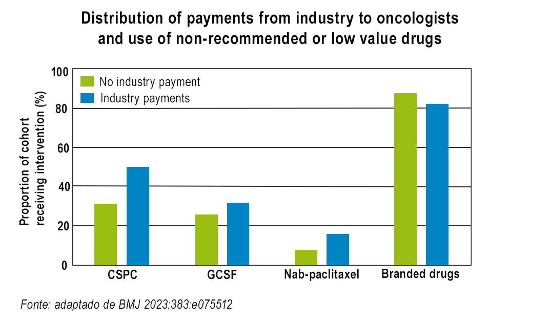 Estudo de coorte entre participantes do Medicare mostra evidências da associação entre o pagamento da indústria farmacêutica a oncologistas e a prática de intervenções médicas não recomendadas e de baixo valor terapêutico. “Esses achados estão em linha com evidências anteriores de que os pagamentos da indústria farmacêutica influenciam a seleção de tratamento”, descreve a análise de Mitchell e colegas, publicada no British Medical Journal (BMJ).