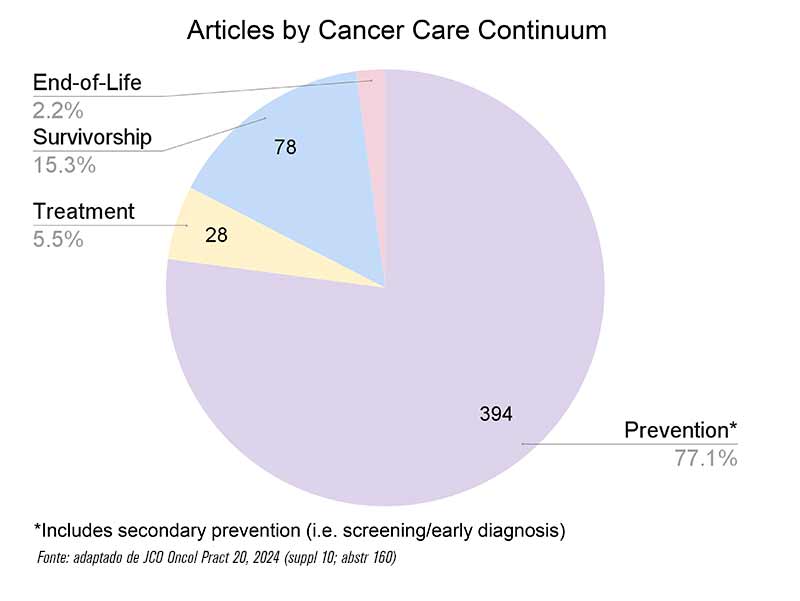 “Nossa estratégia de busca gerou 45.215 artigos. Após a aplicação dos critérios de inclusão/exclusão, 59 artigos foram selecionados, compreendendo triagem (85%, 50 de 59), tratamento (12%, 7 de 59) e sobrevida (5%, 3 de 59) (2 visavam áreas múltiplas). Nenhum artigo teve como alvo os cuidados de fim de vida”, descrevem os autores.