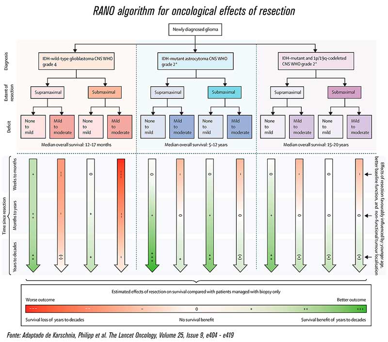 Nesta revisão do grupo internacional de neuro-oncologia RANO, o objetivo foi pesar os prós e contras da ressecção supramáxima, considerando os benefícios de sobrevida esperados em gliomas recém-diagnosticados, contra fatores clínicos, incluindo déficits neurológicos. “Os dados da literatura são compilados em um algoritmo para estimar os efeitos oncológicos da cirurgia, ponderando o benefício de sobrevida esperado de uma ressecção mais extensa em relação a outros fatores clínicos dentro da estrutura do perfil molecular do tumor”, descrevem os autores.