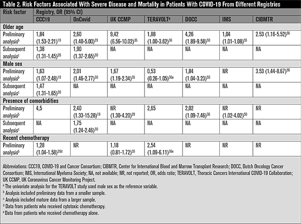 “Os resultados dos esforços de registro permitiram compreender várias consequências da COVID-19 para pacientes com câncer. Primeiro, a taxa de mortalidade por todas as causas em 30 dias foi alta entre pacientes com câncer e COVID-19, com estimativas variando de 13% a 57%. Em segundo lugar, os fatores que foram consistentemente associados à mortalidade incluíram idade, sexo e número de comorbidades (Tabela). Em terceiro, os fatores específicos associados à alta mortalidade foram câncer torácico, câncer hematológico, baixo status de desempenho ECOG e câncer ativo e progressivo (Tabela)”, descrevem os autores.