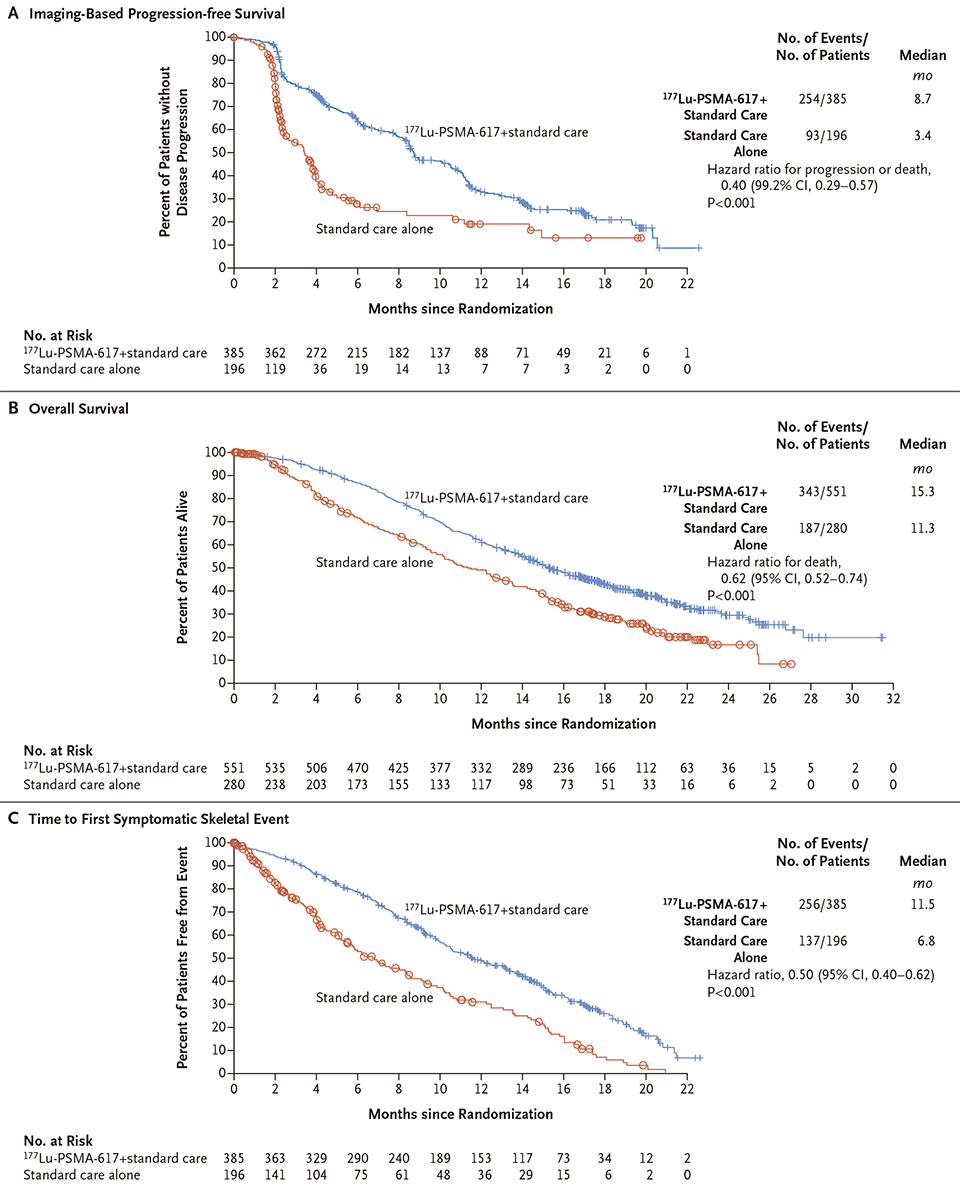 O tempo médio até o primeiro evento esquelético sintomático ou morte foi de 11,5 meses no grupo 177Lu-PSMA-617, em comparação com 6,8 meses no grupo controle (razão de risco, 0,50; IC 95%, 0,40 a 0,62; P<0,001). Entre os 248 pacientes que apresentavam lesões-alvo mensuráveis no início do estudo (RECIST, versão 1.1), a resposta completa foi observada em 17 dos 184 pacientes (9,2%) no grupo 177Lu- PSMA-617 e em nenhum dos 64 pacientes no grupo controle. Um total de 77 pacientes (41,8%) tiveram resposta parcial no grupo 177Lu-PSMA-617 versus apenas 2 (3%) no grupo controle.